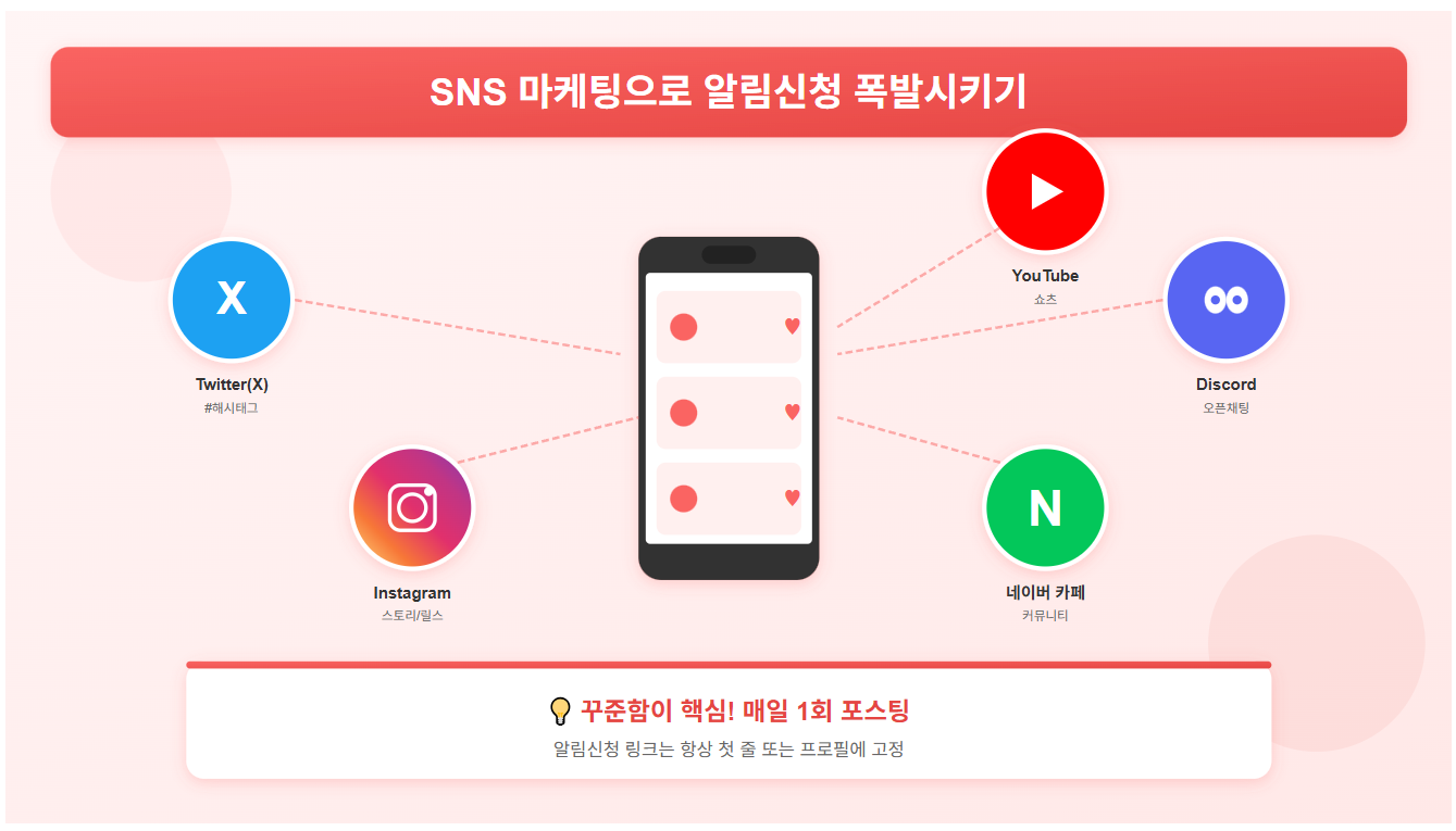 SNS 마케팅할 때 가장 중요한 건 일관성이에요. 하루에 한 번씩 꾸준히 올리는 게 한 번에 몰아서 올리는 것보다 훨씬 효과적이에요. 그리고 알림신청 링크는 항상 첫 줄이나 프로필에 고정해두세요!