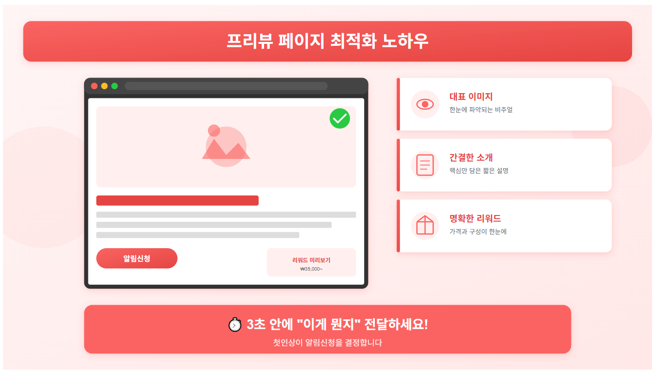 💡 핵심 포인트: 프리뷰 페이지 방문 후 3초 안에 "이거 뭔데?" 라는 질문에 답이 나와야 합니다. 대표 이미지와 한 줄 소개로 승부하세요!