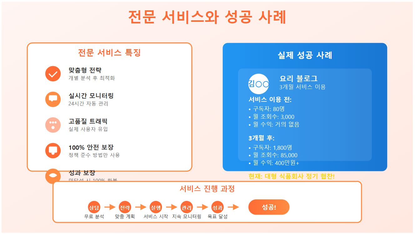 💡 실제 성공 사례: 저희 클라이언트 중 한 분은 월 조회수가 2만에서 15만으로 늘어난 후, 기업 협찬 제의가 쇄도해서 월 수익이 300만원을 넘어섰어요!