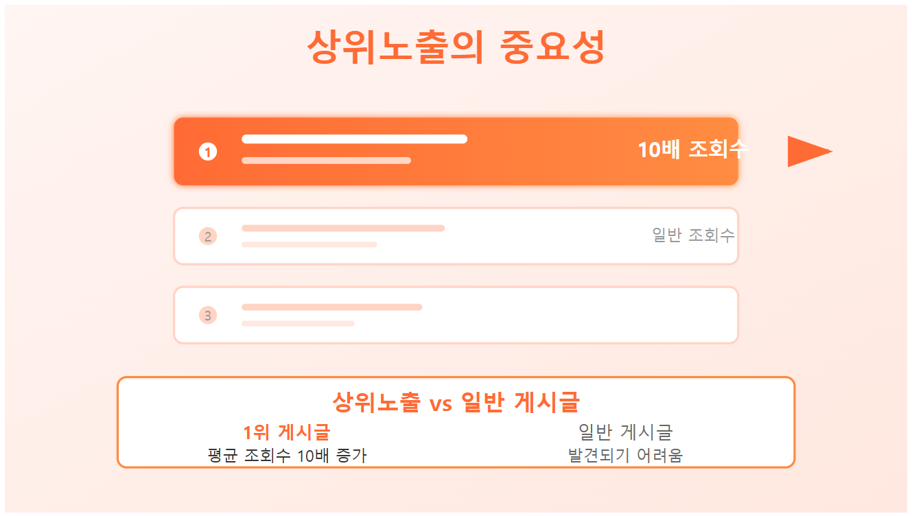 매일 수만 개의 새로운 포스팅이 올라오는 상황에서, 상위노출 없이는 그야말로 모래사장에서 바늘 찾기와 같습니다.