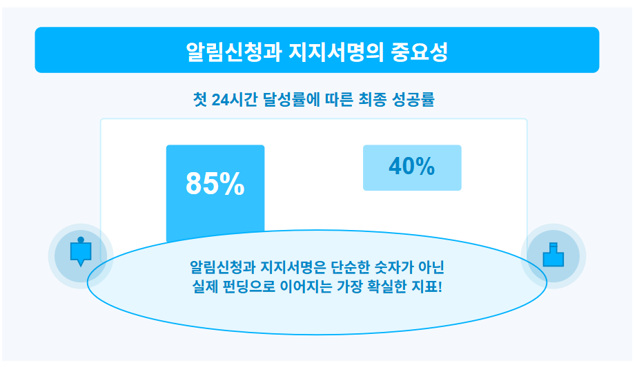 다시 말해, 알림신청과 지지서명은 단순한 숫자가 아니라 실제 오픈 후 '즉각적인 펀딩'으로 이어질 수 있는 가장 확실한 지표인 셈이죠!