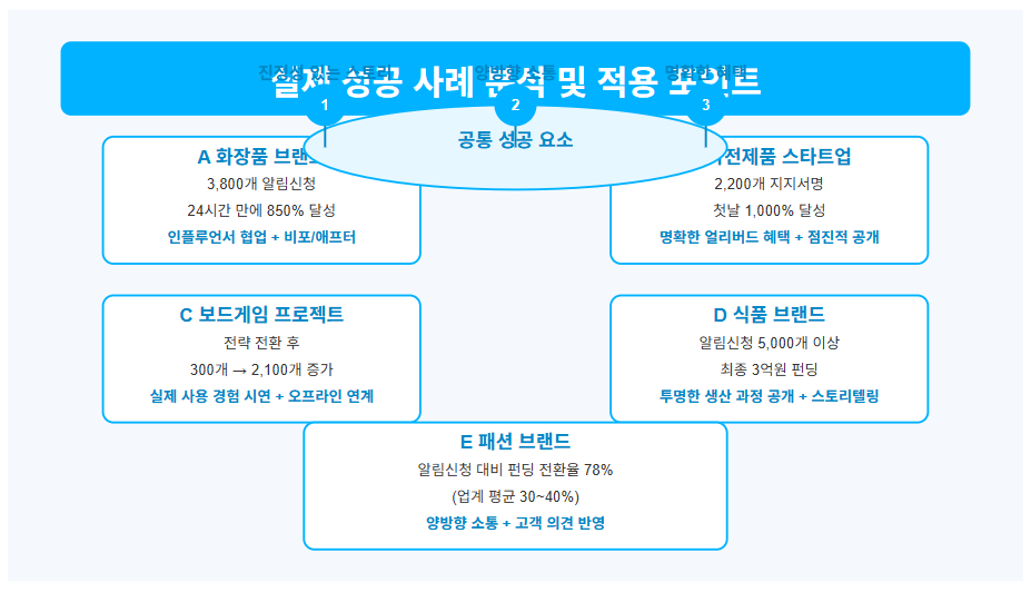 - 성공 요인: 오픈 한 달 전부터 '얼리버드 혜택 미리보기' 티저 콘텐츠로 호기심 유발. 지지서명자에게는 특별 추가 할인과 한정판 액세서리 제공을 약속.