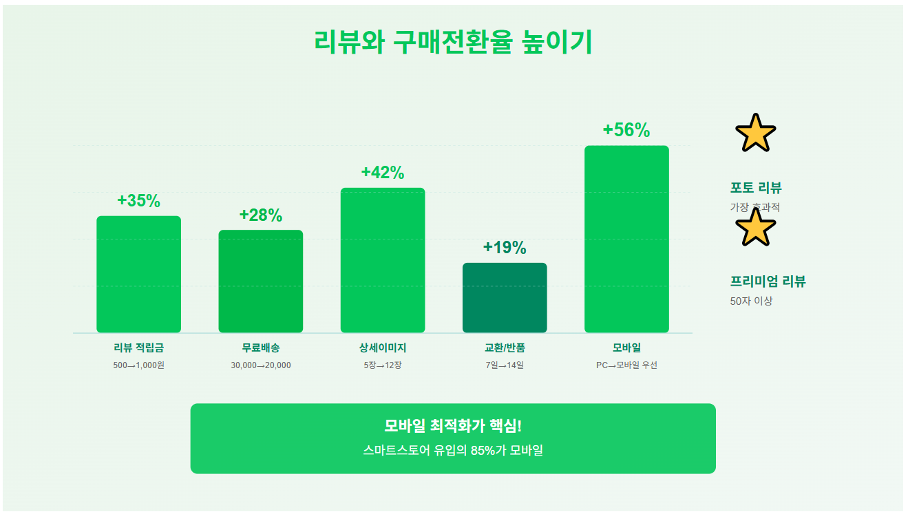 리뷰 관리는 진짜... 생명이에요. 네이버 알고리즘이 최근에 리뷰 비중을 엄청 높였거든요. 특히 포토 리뷰랑 프리미엄 리뷰(텍스트 50자 이상)가 중요해요. 제 스토어는 리뷰 적립금을 500원에서 1,000원으로 올렸더니 리뷰 개수가 2배로 늘었어요!