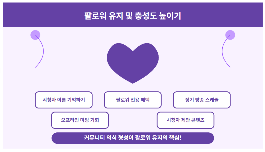 - 시청자 제안 콘텐츠정기적으로 시청자들의 콘텐츠 제안을 받고 실제로 반영하세요. 자신의 아이디어가 방송에 적용되는 것을 보면 소속감이 크게 높아집니다.