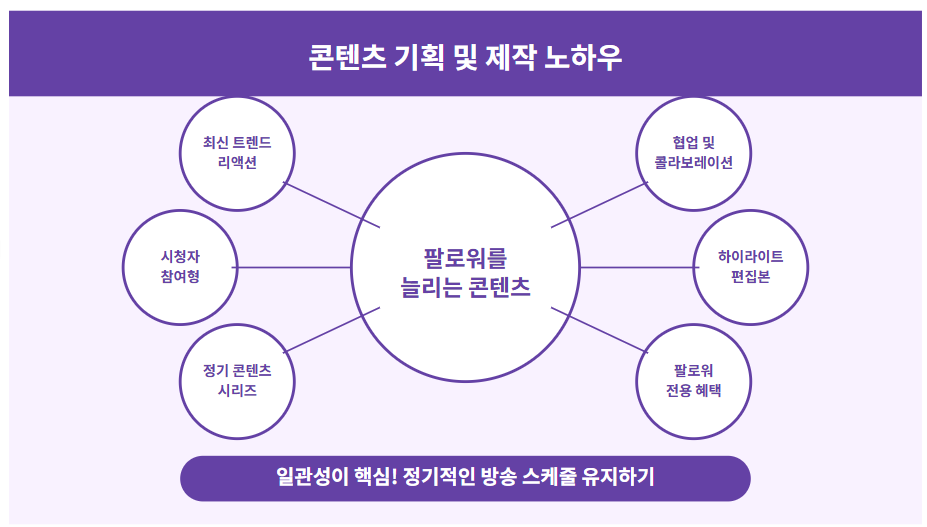 - 협업 및 콜라보레이션 - 다른 스트리머와의 합동 방송. 교차 노출 효과로 단기간 팔로워 증가에 효과적