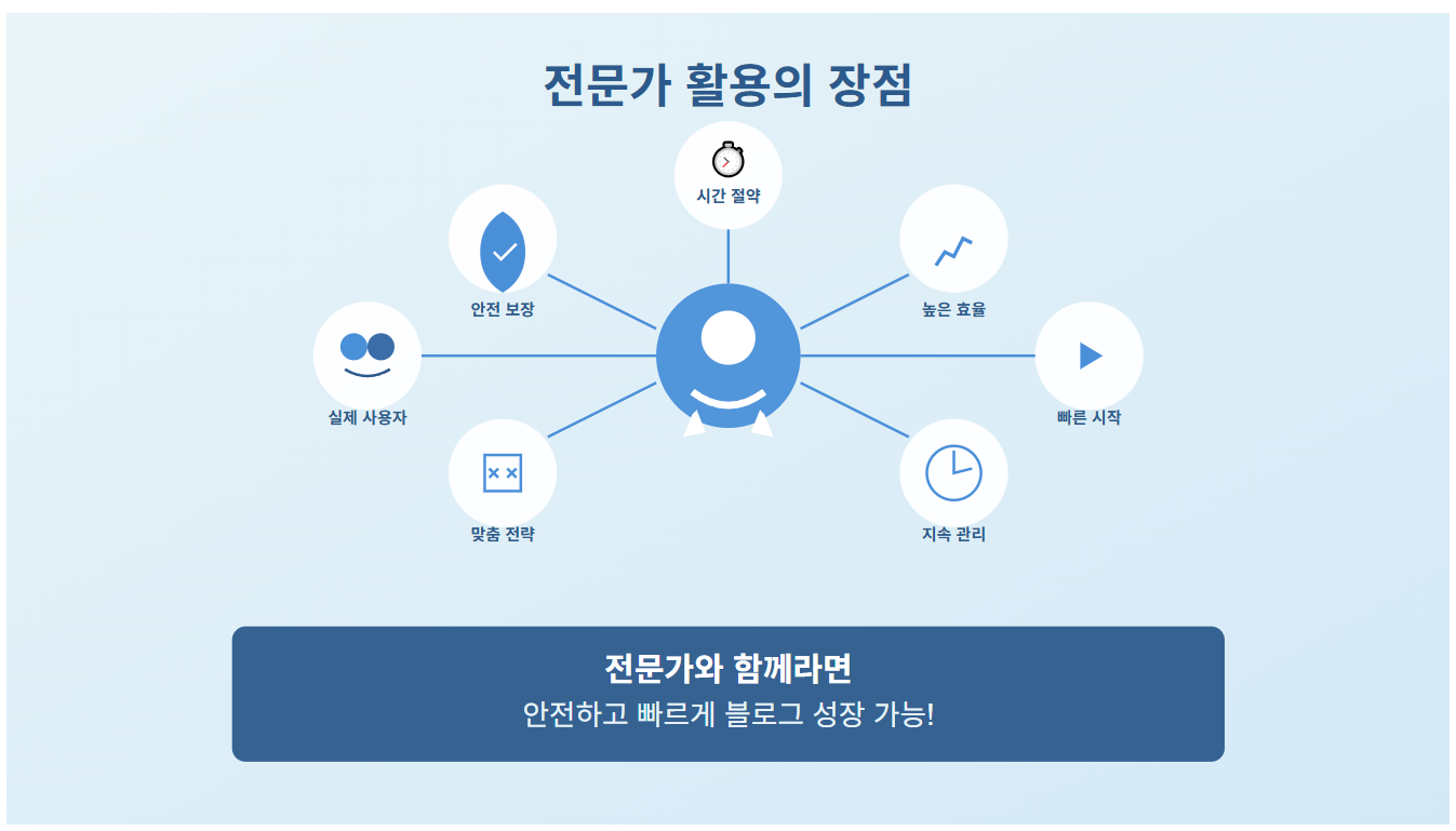 혼자 하기 버겁다면 전문가의 도움을 받는 것도 좋은 방법이에요. 시간과 비용을 아낄 수 있고, 안전하게 블로그를 키울 수 있으니까요. 중요한 건 시작하는 거예요!