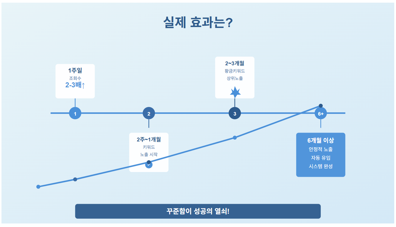 | 6개월 이상 | 주요 키워드 안정적 노출 | 자동 유입 시스템 구축 완료 |